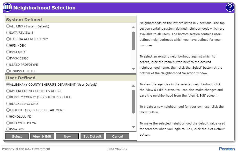 The LInX user has the capability to set any System Defined or User Defined neighborhood as their default neighborhood by selecting the radio button for that neighborhood, then clicking the Set Default button. The designated neighborhood will remain set as the default neighborhood for all subsequent searches for the current and future sessions, until the user selects another neighborhood to search or sets another neighborhood as the default.