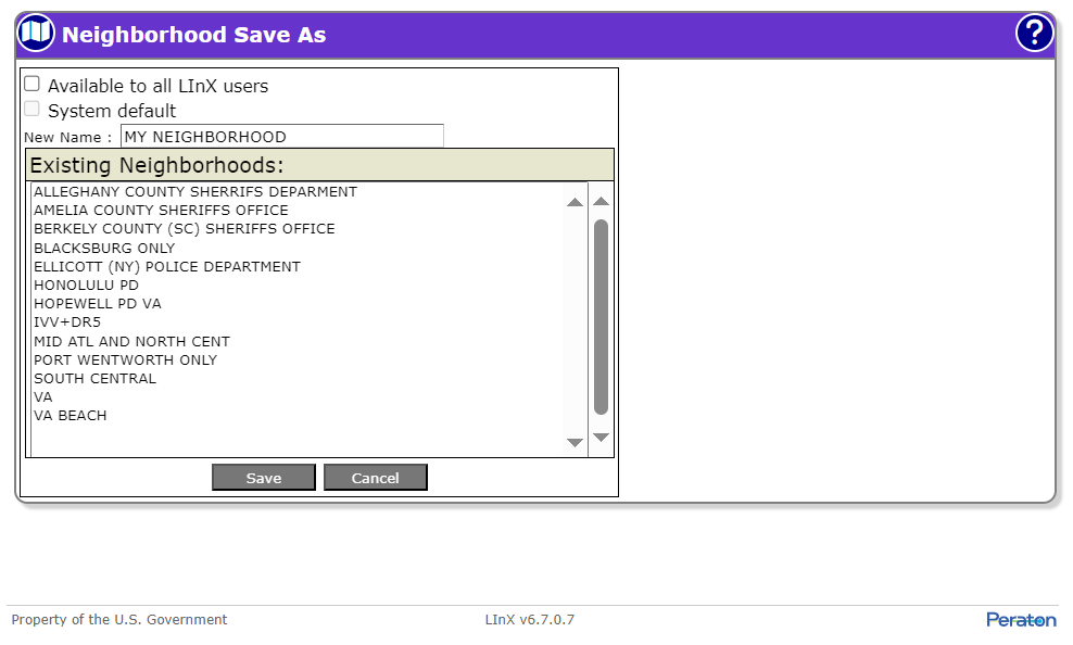 Note: If the user is a Regional Administrator, the neighborhood can be saved as a System Defined neighborhood by selecting the Available to all LInX users check-box. The neighborhood can also be set as the system default neighborhood by selecting the System default check-box. Only Regional Administrators are authorized to create or modify System Defined neighborhoods; therefore, the Available to all LInX users check-box is not available on the Save As screen if the user is not a Regional Administrator.