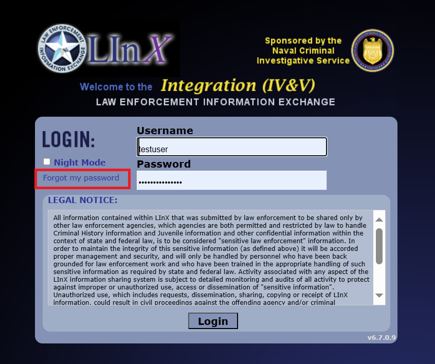 Access to LInX is via the login screen. A valid user ID and password are required to log into the system. When a user first logs in, the default screen presentation is in Day Mode. The user may choose to directly login in Night Mode by checking the Night Mode box. Additional information about Day / Night Mode can be found further along in this discussion.