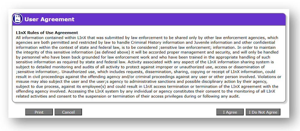 After reading the LInX Rules of Use Agreement, select the I Agree or the I Do Not Agree button.